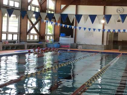 バスに乗って、豊田スイミングスクール平芝校に来ました。スイミングスクールのコーチの方々に元気にあいさつをして、水泳スタート。