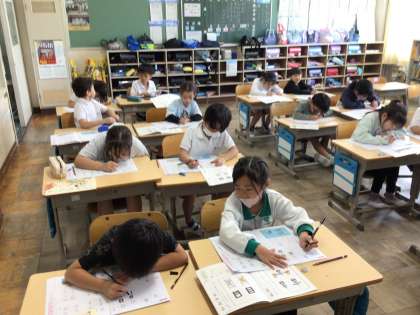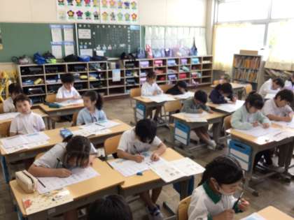2年生の書写では、「点と画の間に気をつけて書こう」というめあてで、学習しました。「目」「魚」の画の間に気をつけて、丁寧に書くことができました。