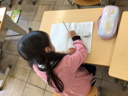 1年生はひらがなの勉強をしています。今日は「な」の練習。書き方や筆順を学んだ後、ノートに練習しました。「な」は、丸く結ぶ部分があって、バランスのとりにくい字ですが、丁寧に書くことができました。