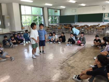 表彰の後は、みんなで爆弾ゲームをして盛り上がりました。音楽が止まった時にボールを持っていた子どもは、好きなものをみんなの前で言っていました。