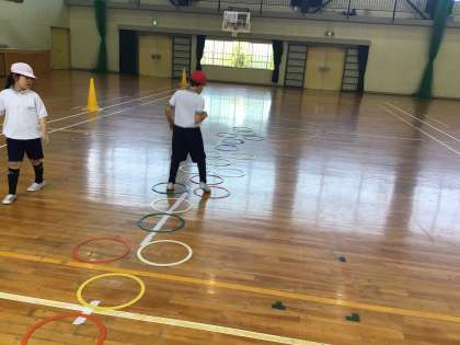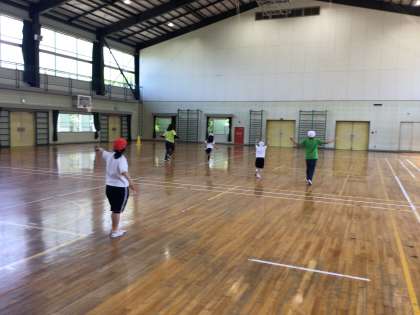 準備体操のあと、5分間走やケンケンパ、なわとび、ボール投げなどをしました。水分補給をしながら、いい汗をかくことができました。