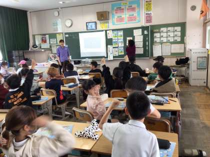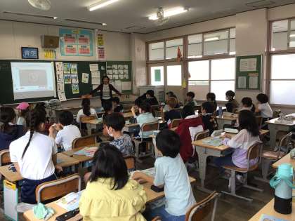 4年生の外国語活動では、ALTのエナ先生と一緒に、英語で「天気の言い方」の学習をしました。ペアでゲームをしたり、ジェスチャーをしたりして楽しく英語を話すことができました。