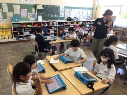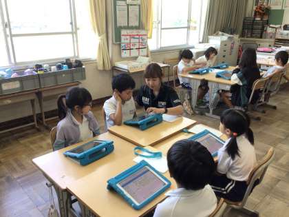 2年生の生活科で、1年生と行く学校探検の準備をしています。学習用タブレットを使って練習しています。
