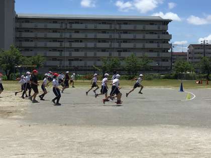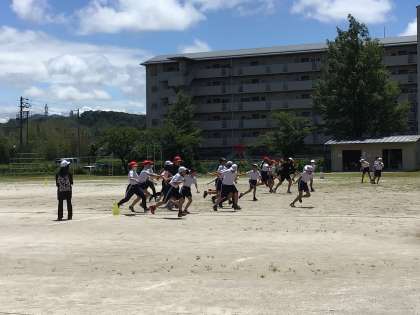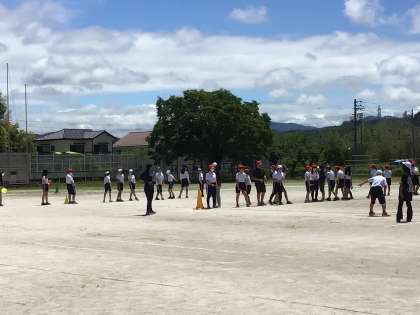 6年生の学年体育では、リレーのバトンパスの練習をしています。上手にバトンが渡せるようになってきました。