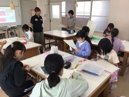 裁縫のクラブでは、ロールペーパーホルダーの型紙を丁寧に切っていました。どんなデザインのものができるか楽しみですね。