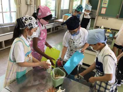 5、6限は5年1組の家庭科、調理実習です。包丁でほうれん草を切ったり、鍋で芋を茹でたりと、慣れないことが多いかもしれませんが、グループで協力して進めていました。