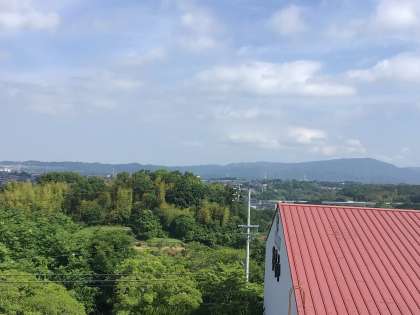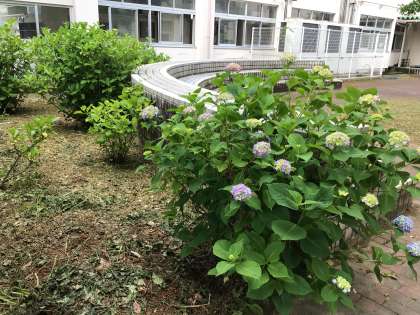 校務支援員の末永さんが草刈りをしていたところのアジサイの花が咲き始めました。あんなにいっぱい草が生い茂っていたところもすごくきれいになっています。また、北舎3階の廊下から北側を眺めると猿投方面の山の新緑がきれいです。