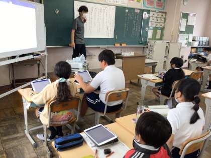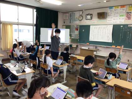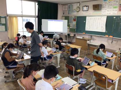 5年国語では、「インターネットは冒険だ」の内容を少しずつまとめています。タブレットの原稿用紙に文字を記入する仕方を確認し,さっそく入力をしていました。