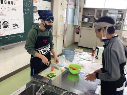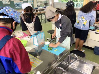 6年2組の家庭科では、「いろどりいため」の調理実習です。にんじんやピーマンなどの野菜を丁寧に包丁で切っていました。上手に切れたかな?