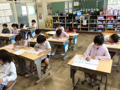 5/29 2年生 書写 公開日 2024/05/29 更新日 2024/05/29 各学年から 今日の2年生書写では、「画のつき方と交わり方に気をつけて書こう」というめあてで学習しました。「刀」と「力」や、「石」と「右」、「上」と「土」など似ているけれども交わり方で変わる漢字を丁寧に書きました。