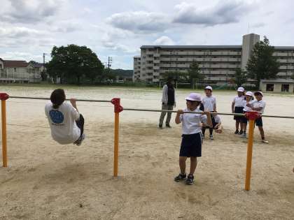 5/30 2年体育 公開日 2024/05/30 更新日 2024/05/30 各学年から 鉄棒の学習をしています。腕の力だけで鉄棒にぶらさがったり、足をかけてぶらさがったりしていろいろな動物に変身です。子どもたちから「先生もやってみて」の声が上がり、先生も挑戦です。