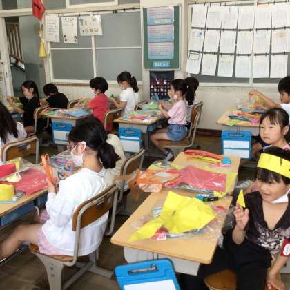 5/30 2年生 図工 公開日 2024/05/30 更新日 2024/05/30 各学年から 2年生の図工では、色画用紙を使っていろいろな物を作りました。はちまきにしたり、服につけたりしながら、楽しんで作品を完成させました。
