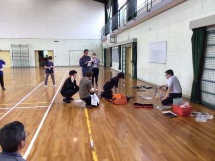 5月30日授業後に、消防署の方々をお招きして、シミュレーション訓練を教職員で行いました。傷病者を救急隊員に引き渡すまでの役割分担を確認したり、どのような応急処置が必要か考え、適切な処置ができるようにしたりしました。訓練後、消防署の方に「熱中症、窒息の子への応急手当について」講習していただきました。