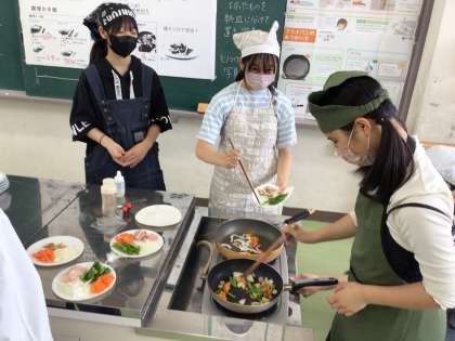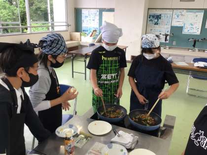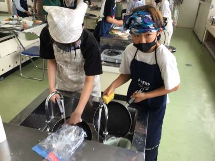 今日は6年1組の調理実習の番です。「いろどりいため」なのでにんじんやピーマンを切った後、炒めていました。フライパン等の片付けもグループで協力して進めていました。