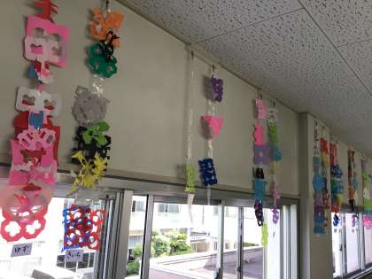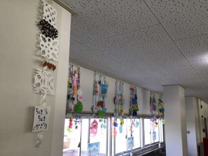 1年廊下に図工で作った「ちょきちょきかざり」が展示してあります。一人一人が工夫して作った色鮮やかな飾りです。今日の授業参観の折に見ていただけるとありがたいです。(個人情報保護の観点から写真撮影や動画撮影はご遠慮ください)