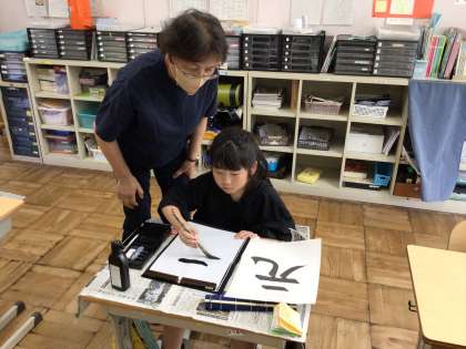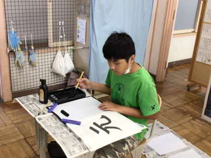 7・8組の書写では、「元」を書きました。曲がりの筆使いが難しいので苦労していました。