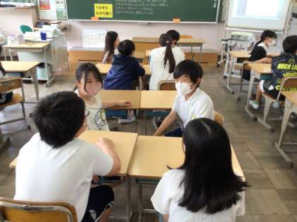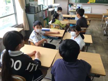 毎週金曜日の朝はえがおタイムです。6月からは「アドジャン」です。アドジャンのかけ声に合わせて一斉に好きな数だけ指を出し,指の数を合計し、お題の表にしたがって質問に答えるものです。頷きながら話を聴くことができたかな?