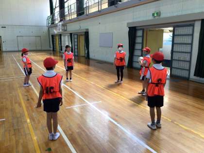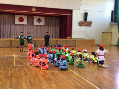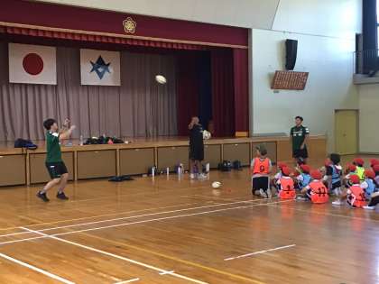 トヨタヴェルブリッツによるタグラグビー体験会を実施しています。2限は4年1組です。プロ選手のパスを見て歓声が上がりました。選手に教わりながら楽しくタグラグビーを体験していました。