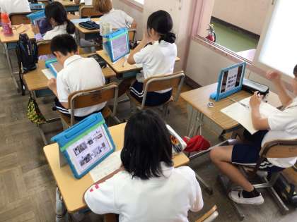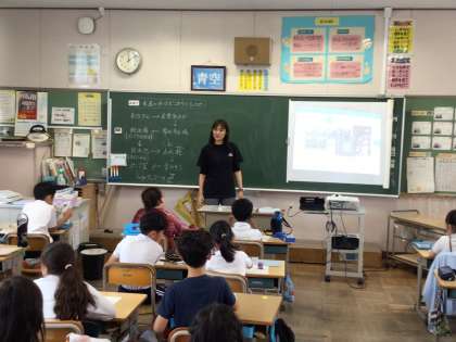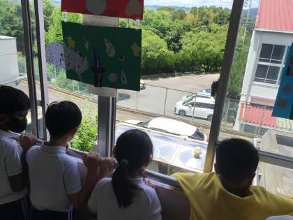 4年社会では、「水道の水はどこからくるのか」というめあてで学習を進めていました。北舎北側に平井小学校の飲み水を貯めるタンクがあることを後藤先生が説明して、廊下から覗きこんでいました。「あのタンクの水がパイプを伝って蛇口まで来ているんだ」と驚きの様子でした。