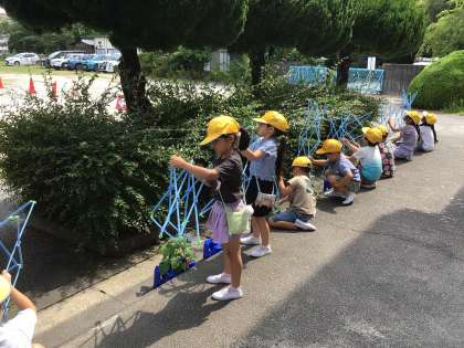 1年生の生活科で育てている、あさがおが大きく育っています。今日は、つるがでてきたので、支柱をたてました。大きく育つように、世話を続けていきます。
