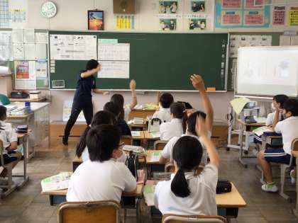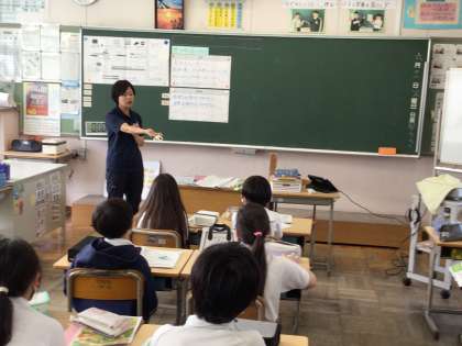 5年家庭科では、裁縫セットにあるハサミなどの道具の使い方について、集中して話を聞いていました。瀬尾先生の問いかけに対して反応がよく、挙手も多かったです。