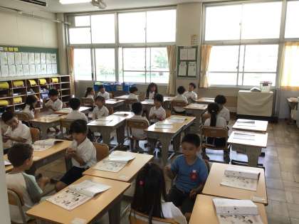 1年生の音楽では、カスタネットや鍵盤ハーモニカの楽器を使います。今日は、カスタネットを使って、リズムを取りながら歌を歌いました。ペアで歌いながら、じゃんけん遊びを楽しみました。