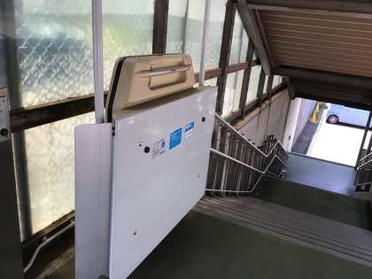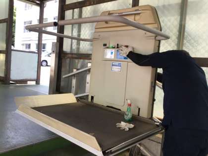体育館の階段に機械が取り付けられているのを知っていますか?これは車イス用昇降機といって、車イスのままでも階段の登り降りができる機械です。校舎にはエレベーターがありますが、体育館へはこの階段を使うしか方法がありません。今日はこの機械の定期点検日でした。