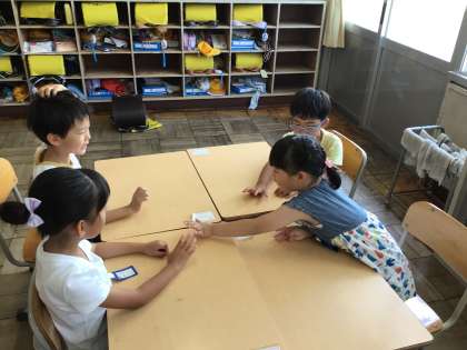 6/14 えがおタイム4 公開日 2024/06/14 更新日 2024/06/14 各学年から 1年生のえがおタイムの様子です。1年生はアドジャンで指の数のたし算が難しいけれど、グループで一緒に指の数を1、2、3、…と数えて合計を求めていました。グループの話を互いにしっかり聴くことができていました。