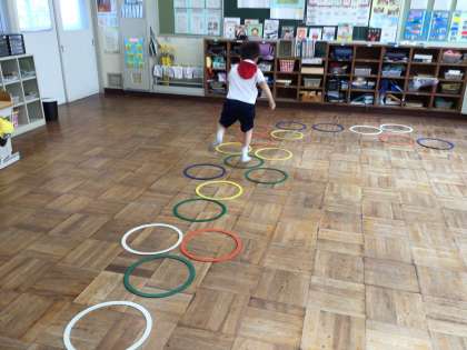 6/14 7・8組体育 公開日 2024/06/14 更新日 2024/06/14 各学年から 今日は気温が高めなので、体育館で5分間走のみ行って、8組教室へ移動しました。ケンケンパ、キャタピラー、オセロなど室内で楽しく活動しました。
