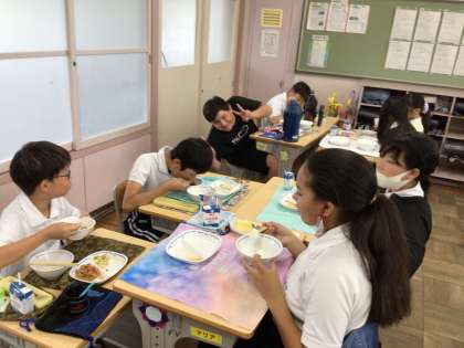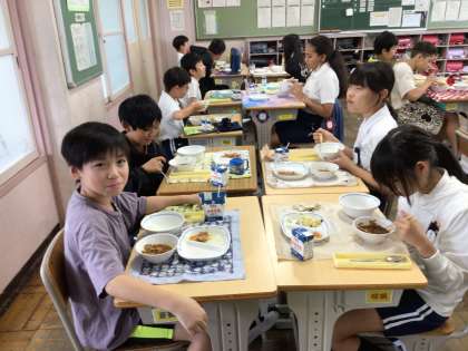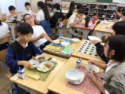 楽しく会食をしている様子です。今日は愛知を食べる学校給食の日だそうです。