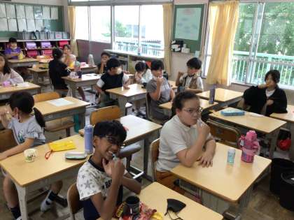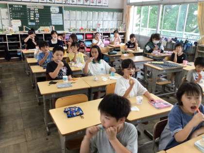 6月第1週の歯みがき週間は終わっていますが、給食の片付けが終わると係がCDを流してくれます。歯みがきミュージックスタートです。曲と一緒に流れる指示にしたがって歯を磨いていきます。リズミカルで楽しく歯を磨くことができています。
