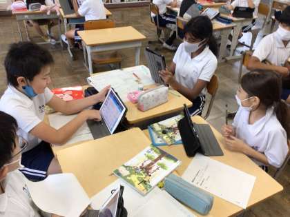 6/ 18 5年国語 公開日 2024/06/18 更新日 2024/06/18 各学年から 「文章のすじ道を立てながらタウン誌の記事を書こう」というめあてで、学習を進めていました。タブレットで調べたことをワークシートに記入しながら構成メモを作っていました。
