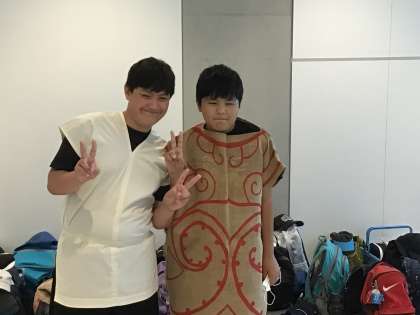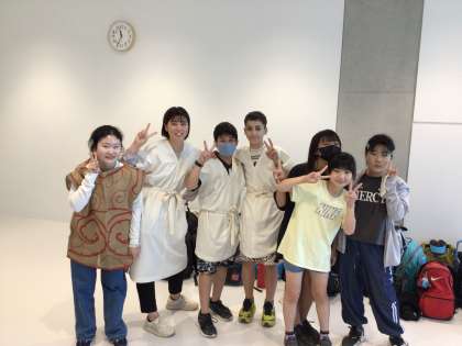 竪穴式住居をイメージして柱を組み立てたり、縄文時代の服装を着る体験をしたりしました。