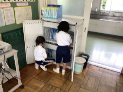 昨日はタブレット持ち帰り日でした。登校してくるとすぐにタブレットを保管庫に収納していました。