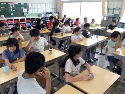 6/20 5年朝の会の様子 公開日 2024/06/20 更新日 2024/06/20 各学年から 読み語りが終わるとすぐ木曜日なのでフッ化物洗口を行っていました。CDの音楽にのってブクブク口の中を洗口していました。