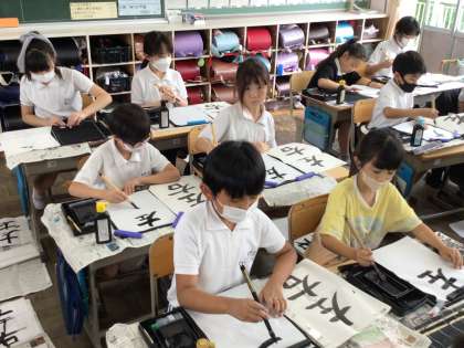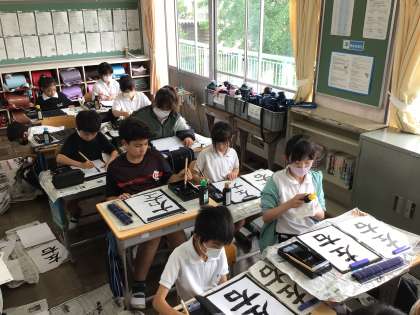 4年1組の書写では、「左右」の清書をしました。字のバランス、書き順、1画目が短めに書くなど、ポイントを再度おさらいをして、清書に臨みました。過去2回の練習の成果は出せたかな?