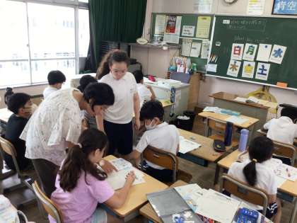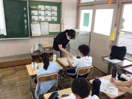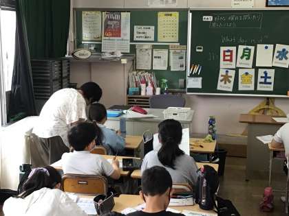 4年外国語活動では、「好きな曜日を聞いたり、答えたりしよう」というめあてで学習を進めていました。ALTのエナ先生にわからないところを質問しながら進めていました。