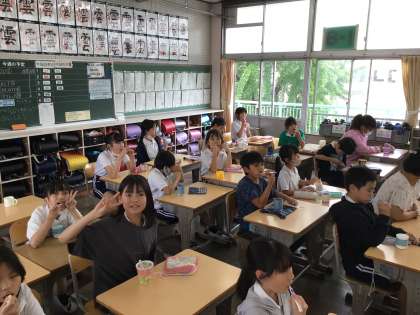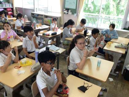 6/26 給食が終わると… 公開日 2024/06/26 更新日 2024/06/26 各学年から 今日も給食が終わるとすぐ歯みがきです。食器などの片付けをするとすぐコップと歯ブラシを準備しています。今日もCDの音楽でノリノリで歯みがきをしていました。