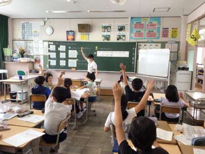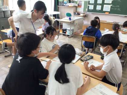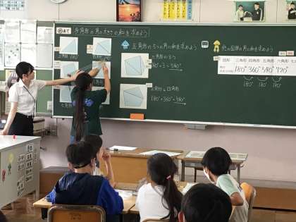 6/27 5年算数 公開日 2024/06/27 更新日 2024/06/27 各学年から 5年算数では、「多角形の角の大きさの和の求め方を考えよう」といめあてで、学習を進めていました。グループで、どうやって角度を求めるのか、補助線を引いて図形を分けて考える方法など、考え方をどんどん出し合っていました。
