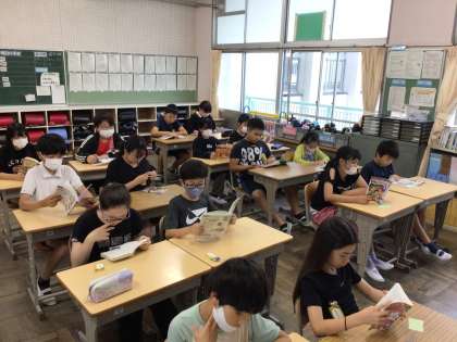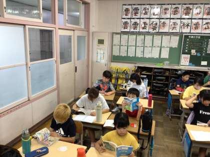 雨で濡れていないか尋ねると、「今日は大丈夫!」と言いながら朝の準備をしていました。廊下はかなりジメジメしていますが、教室は朝からエアコンを入れて廊下と大違いです。8時半からは静かに読書が始まりました。今週もがんばりましょう。