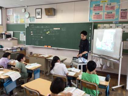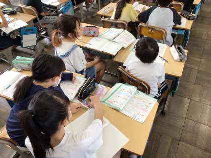 4年算数では、「0,1Lを10等分した数について考えよう」というめあてで学習を進めていました。教科書の図を確認して、0,01という新しい小数単位について考えていました。