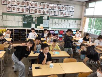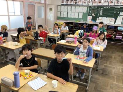 今日の給食はどうだったか聞くと、「たくさん食べた!」「おかわりをしたよ」と笑顔で答えてくれました。片付けが一段落すると係の子がCDを流すので、歯みがきが始まります。しっかり歯を磨いていきましょう。
