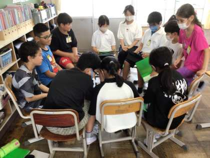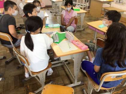 5年生は、総合的な学習の時間にキャンプの準備をしています。今日は、グループごとにキャンプファイヤーでの出し物を計画しました。ゲームやダンス、クイズなどを決め、分担したり、考えたりしました。