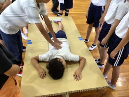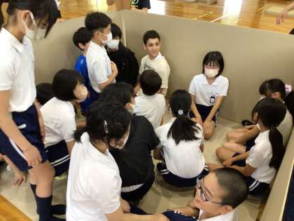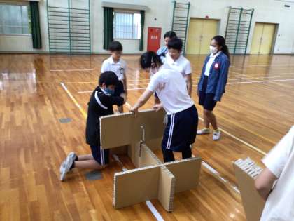 間仕切りを作ったところに入ってみました。段ボール素材のベットも結構丈夫でびっくりしていました。