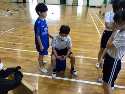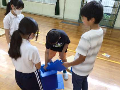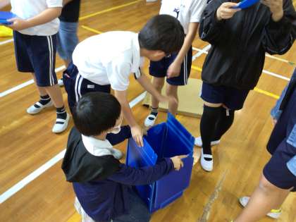 簡易トイレを組み立ててみました。段ボールの箱に組み立て方を見て、協力して組み立てました。