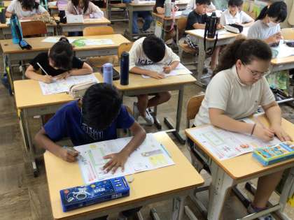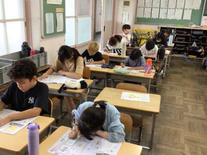 4年2組の書写は今日から硬筆です。毛筆で練習をした「林」「雲」「左右」について書写ノートでポイントを確認をしながら、鉛筆で練習をしました。字のバランスなど気をつけて黙々と練習ができました。