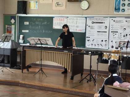 7/3 5年音楽1 公開日 2024/07/03 更新日 2024/07/03 各学年から 5年音楽では、打楽器のプロの演奏家に来ていただいて、楽器の紹介や説明を受けた後、演奏を聴いて感想をワークシートに記入をしていました。