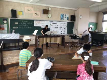 打楽器演奏会の様子です。マレットを複数本もって演奏する姿に驚いていました。