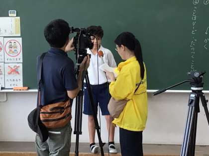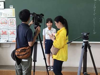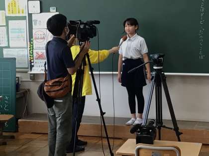 4年生の総合的な学習で岩本川での学習について、代表3名がインタビューを受けました。