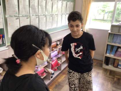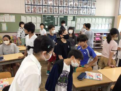 7/4 6年外国語1 公開日 2024/07/04 更新日 2024/07/04 各学年から 6年外国語では、ALTのエナ先生と一緒に学習を進めていました。How was your weekend? とペアで尋ねて会話を進めていました。リアクションをつけて会話をするなど楽しく英会話をしていました。